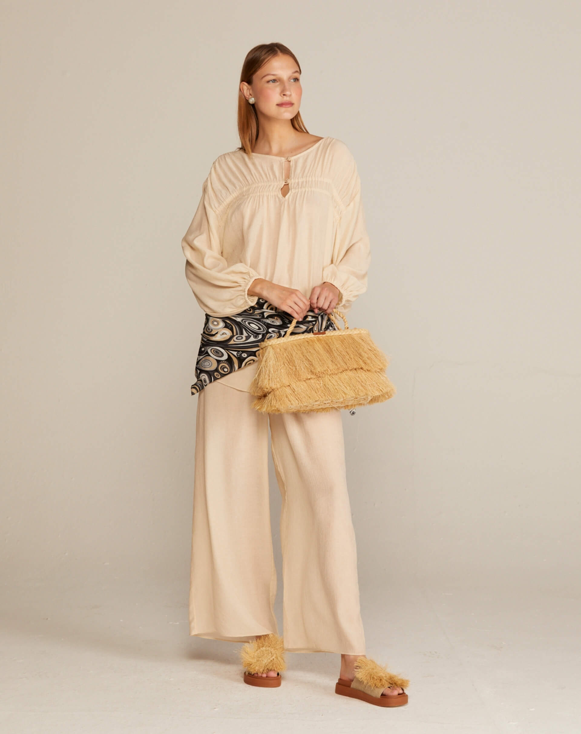 A Calça Ágata da marca Catarina Mina redefine o conceito de "comfy chic" com um toque de exclusividade artesanal. Ela oferece um caimento fluido e fresco, com a vantagem de amassar menos que a viscose pura. O conforto é garantido pelo cós com elástico, que se ajusta suavemente à cintura, mas o verdadeiro charme reside nas ponteiras em crochê feitas à mão, um detalhe precioso que eleva a peça. Ideal para formar conjuntos monocromáticos ou ser usada como peça-chave, ela transita com leveza do dia a dia no trabalho a almoços e festas de final de ano. É a calça que une a praticidade do design funcional à beleza do artesanato brasileiro.