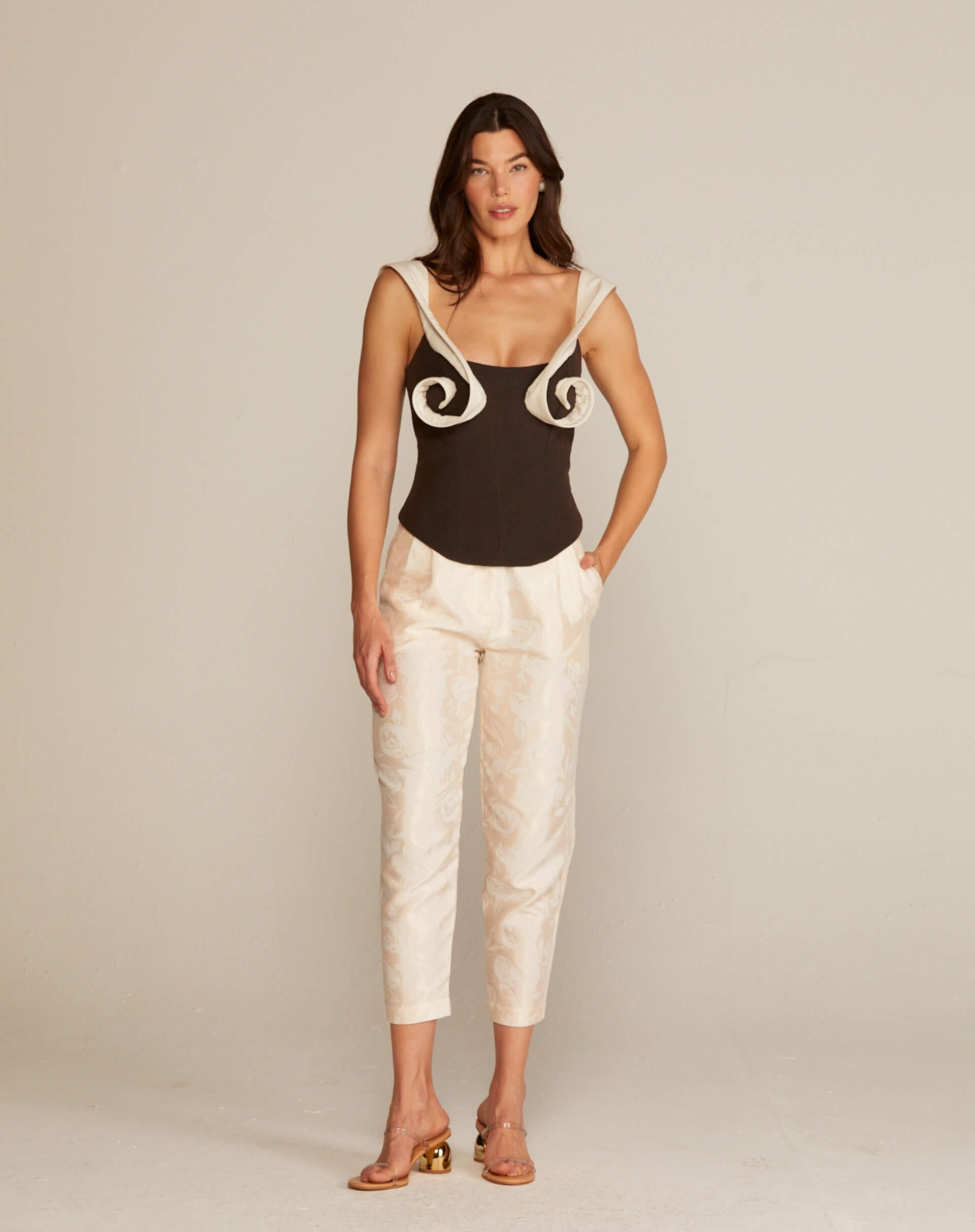 O Corset Victoria da marca ALUF é uma peça que transita entre o vestuário e a arte. Confeccionado em uma mistura resistente de algodão e poliéster, ele traz a estrutura clássica do corset com barbatanas internas, garantindo suporte e uma silhueta perfeitamente desenhada. O toque de genialidade e exclusividade fica por conta das alças contrastantes aplicadas manualmente em formato de caracol, um detalhe artístico que atrai todos os olhares. Sofisticado e singular, é a peça ideal para compor looks impactantes, de jantares elegantes a festas de final de ano. É o equilíbrio perfeito entre a rigidez da estrutura e a poesia do feito à mão.
