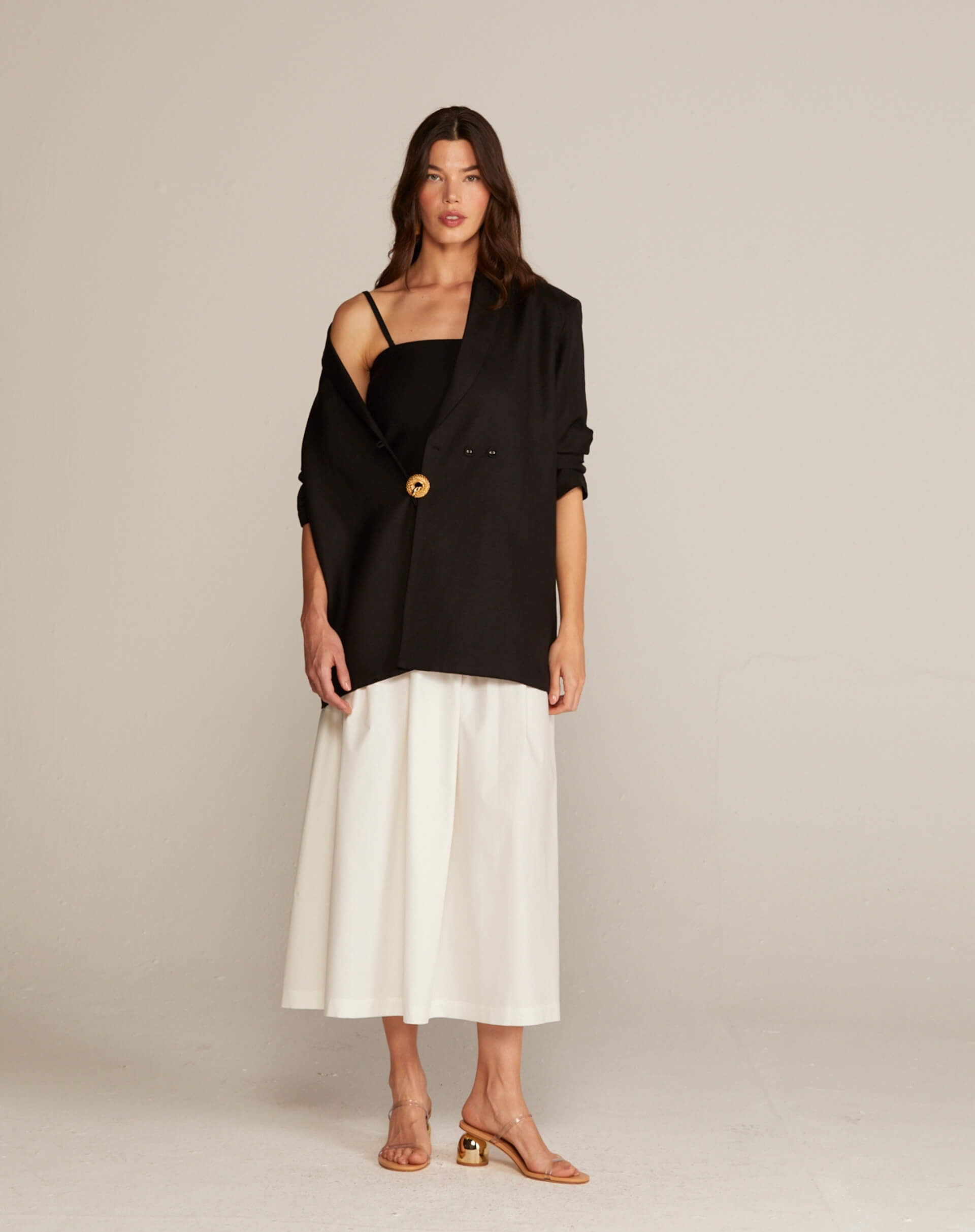 O Vestido Ágata da marca MEYO é a união perfeita entre design inteligente e elegância funcional. Seu grande diferencial está na combinação de tecidos: o corpo em malha tecnológica (com viscose e elastano) garante conforto e ajuste perfeito à silhueta, enquanto a saia em 100% algodão oferece estrutura, frescor e um caimento impecável. Versátil nas opções monocromáticas ou bicolor, ele transita com sofisticação do dia a dia no trabalho a almoços, jantares e festas de final de ano. É a peça completa que resolve o look com um equilíbrio único de estrutura e conforto.