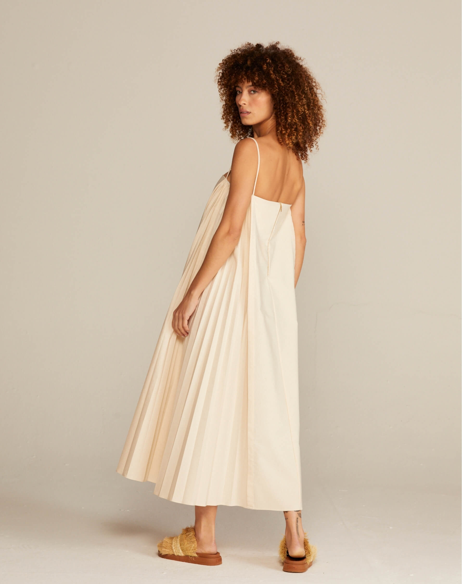 O Vestido Soleil da marca ALUF é a prova de que o luxo contemporâneo caminha lado a lado com a consciência ambiental. Confeccionado em um tecido sustentável inovador, composto por algodão e poliéster reciclados, ele une ética e estética com maestria. Seu design arquitetônico apresenta plissados laterais estratégicos, que criam volume e movimento, desenhando a silhueta de forma única e elegante. Com forro em acetato para conforto térmico, é a escolha ideal para mulheres sofisticadas, transitando do ambiente corporativo a jantares e festas de final de ano. É a peça que carrega propósito, sustentabilidade e um design inesquecível.